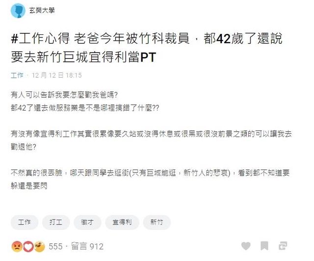 噓 tw00168185 : 自己出去工作養活爸媽,就不丟臉 12/16 08:48