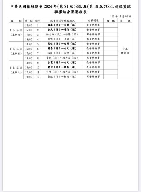中華民國籃球協會2024年第21屆SBL暨第19屆WSBL超級籃球聯賽熱身賽賽程表已公布