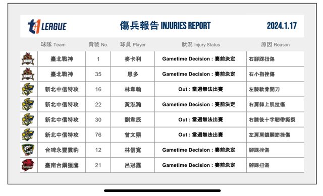 標題[情報] T1 2024.01.17傷兵報告