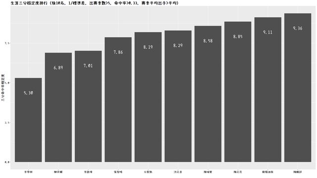 分命中率的標準差越小,代表三分命中率變化越小,亦即三分命中率越穩定。