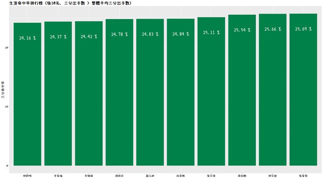 最後是生涯三分命中率的排行,這裡我提供了前十名和後十名的排行,篩選的條件為「三