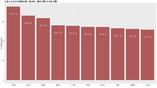出現於前幾張圖的洪志善也在此排行上,三分出手比例為66%。第三名以後的占比比較平