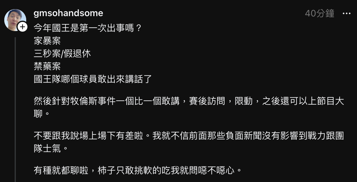 推 omracnata : 台籃文化嗎?其他國家球員會大聲噴隊友私下不檢點的 03/31 15:11