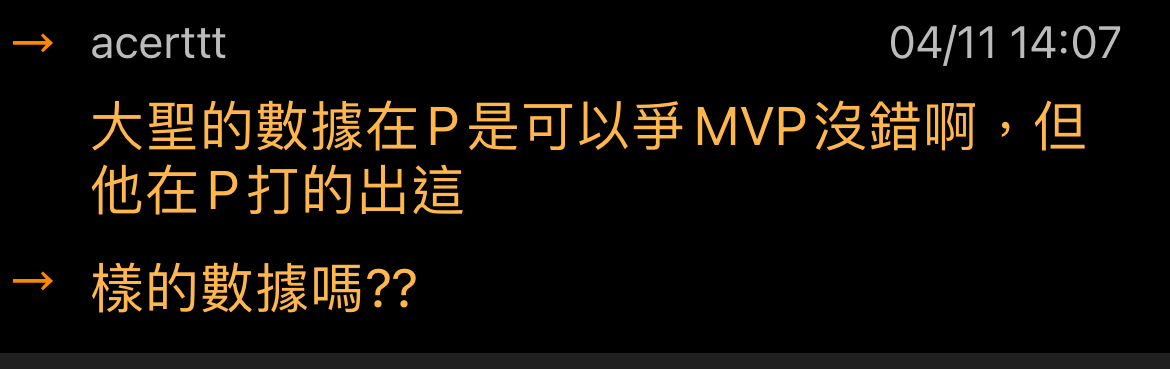 → acerttt : 大聖的數據在P是可以爭MVP沒錯啊,但他在P打的出這 04/11 14:07