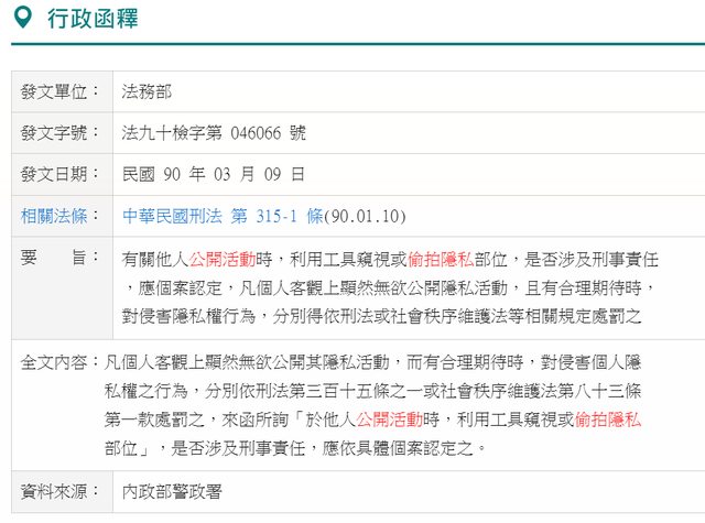 法務部表示有關他人公開活動時,利用工具窺視或偷拍隱私部位,是否涉及刑事責任,應