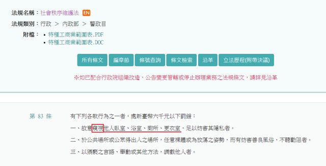 社會秩序維護法第83條僅規範窺視他人臥室、浴室、廁所、更衣室,與此案不合,