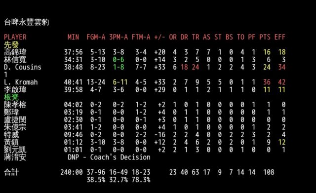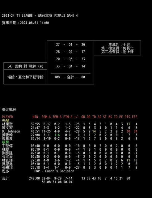 │ 場館:臺北和平籃球館 │ 108 - 合計 - 80 │