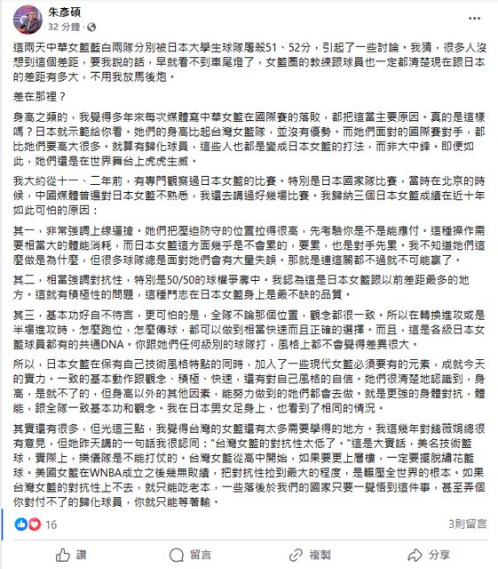 標題[討論] 朱彥碩FB–談瓊斯盃女籃慘輸日本大學生