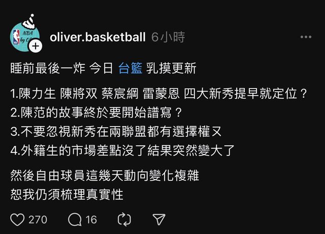 https://www.threads.net/@watching.nba/post/C9QADlqSfs-/?xmt=AQGzUb-0tMx11rMH9eSG QmXfVn8N4MIHZ9JC62h1XiL35g 另外一篇拼命哥的乳摸 睡前最後一炸 今日 台籃 乳摸更新 1.陳力生 陳將双 蔡宸綱 雷蒙恩 四大新秀提早就定位? 2.陳范的故事終於要開始譜寫? 3.不要忽視新秀在兩聯盟都有選擇權ㄡ 4.外籍生的市場差點沒了結果突然變大了 然後自由球員這幾天動向變化複雜 恕我仍須梳理真實性 https://i.imgur.com/O3Dw3SZ.png
