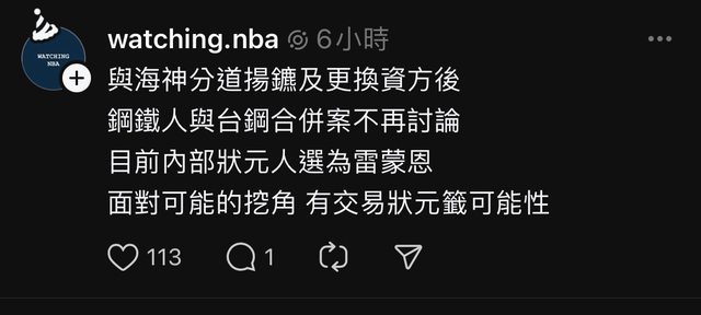 與海神分道揚鑣及更換資方後 鋼鐵人與台鋼合併案不再討論 目前內部狀元人選為雷蒙恩 面對可能的挖角 有交易狀元籤可能性 https://i.imgur.com/ZTicUyI.jpeg