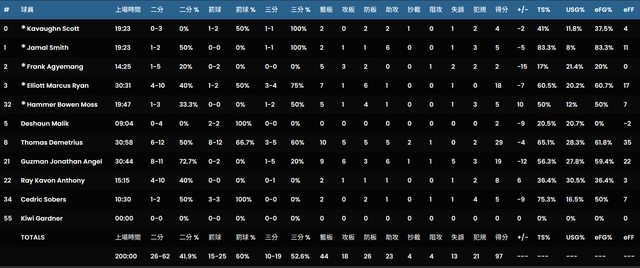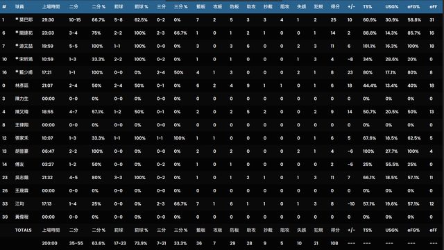球 員 時 間 2PT 3PT FT OR DR TR AS ST BK TO PF PTS EFF +/- TS%