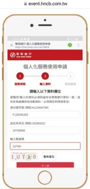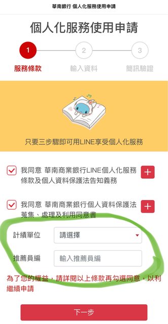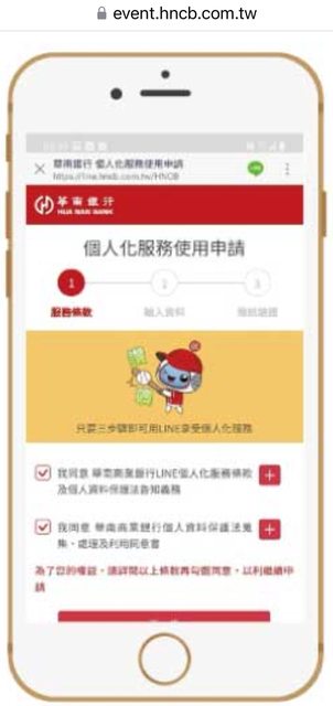 依照這個網頁的說明 https://event.hncb.com.tw/wealth/news_post4 下載華南官方line之後,第一步打勾同意條款 https://i.imgur.com/3zbGm6N.jpg