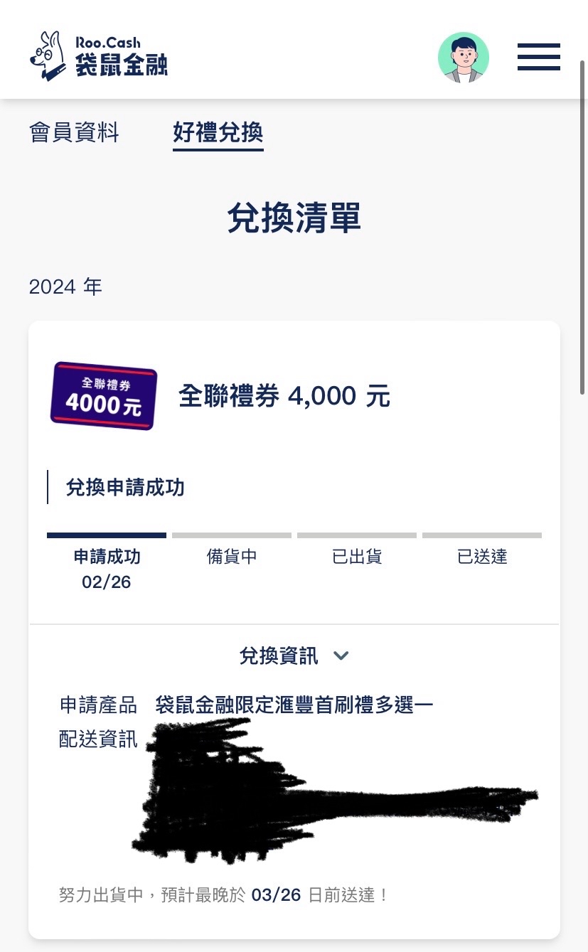 ruby02162000: 剛收到袋鼠的兌換簡訊,填完後顯示努力於3/26前送到02/26 16:32