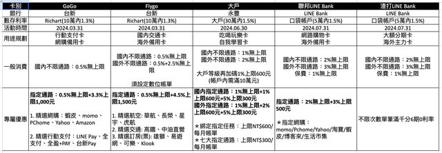 2024年到現在也過一季了 三月底也是很多家信用卡活動到期的日子 分享一下目前手上常用的卡片 等之後會再更新一波 1. 台新gogo卡:行動支付卡,現在出門能只帶手機就不想帶包包,主要刷行動支付有3.8 %回饋(之後改點數制了 哭啊~) 2. 台新flygo卡:交通卡,主要刷高鐵跟加油有5%回饋 3. 聯邦LINE Bank:網購卡,除了出門外我熱愛網購,這張回饋最高有到5%、淘寶更到6% 真的很猛,平常沒有行動支付的通路全都刷這張也有無腦2%無上限,國外是3%無上限 4. 渣打LINE Bank:大額分期卡,當初會辦是為了買iPhone15,開卡當下直接刷一支同時 分期,實測也真的分期還有2%回饋可以拿,其他只要出國有大筆消費,也都直接拿這張也 有3%無上限 https://i.imgur.com/ekEmK4n.png