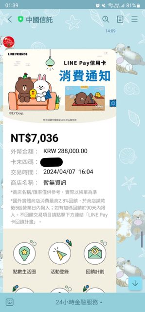 圖二三是中信linepay卡(JCB) 288000/7036=40.93 我知道是看入帳日的匯率 兩筆消費入帳日只差一天 但也差太多了 那週韓國換錢所的現金是換41.7 心得:分享給近期出國玩的板友,慎選用卡,有時候用現金還比較划算 -- ※ 發信站: 批踢踢實業坊(www.ptt-club.com.tw), 來自: 220.129.194.203 (臺灣) ※ 文章網址: https://www.ptt-club.com.tw/creditcard/M.1713117178.A.677