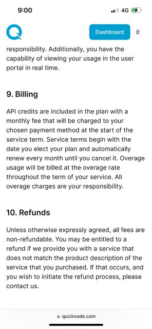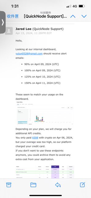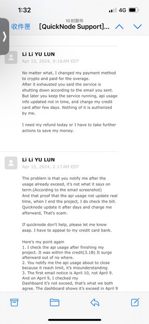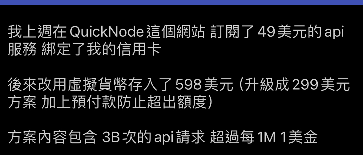 我上週在QuickNode這個網站 訂閱了49美元的api服務 綁定了我的信用卡 後來改用虛擬貨幣存入了598美元(升級成299美元方案 加上預付款防止超出額度) 方案內容包含 3B次的api請求 超過每1M 1美金 後來我暫時沒要使用了(4/9) 看了存入的預付款也還夠 因為是短期需求 我就想說把後 面存的598花完就好 先擺著等月底取消訂閱就好 那時候我這個月的信用卡帳單剛好沒繳 其實QuickNode 有發付款失敗的信 但我當下沒收 到 就在我14號繳完卡費 額度恢復以後 突然一次被刷一大筆款項 是超過用量的費用 (預付款花完了,另外又再超過 直接從我一開始綁的信用卡扣) 目前的狀況是 已經被刷了500多美金 還有900多美金對方一直在嘗試扣款 但目前額度不 足所以他們扣不到 這兩天在跟客服來回 我強調的大概有幾點 1.他們的用量統計更新不及時讓我誤判 2.信件中寫額度快不足了 可能會隨時停止服務 讓我以為只會用到裡面存的額度(其實這 幾封信我是後來才看到) 3.後續改用信用卡付款沒有經過我確認 我也看了一下服務條款 他們有寫用量要自行注意 超過額度不得退款 用量如果被冒用他們不負責 超過的部分併 入下個帳單等等 客服的回應現在是很強硬的 他們使用紀錄上就是這麼多 我後續的確也沒每天一直盯著後台看紀錄有沒有超過(我的專案暫停了 所以根本沒在用 ) 但這點我也無從提出爭議 信件說餘額不足會暫停 沒暫停還繼續開著 到14號才一次給 我扣一堆通知我 讓我覺得很土匪 我現在預計會掛失 至少後續900不會再被扣到 但前面被扣的600還是有點覺得冤枉想爭回來 今天一直在查資料 想請問這種事件走爭議款項會有可能通嗎 因為確實是我本人使用 但 我覺得我根本無意要購買後續服務 想請問大家有沒有什麼建議 因爲如果這種消費糾紛很難透過信用卡公司處理 我也是傾向 認賠 不然後續一堆流程還不一定成功我覺得成本太高 謝謝 附上相關截圖 客服信件 https://i.imgur.com/NB0w7bf.jpg