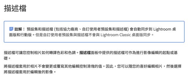 **描述檔 (Profile)** 的功用主要是決定如何演繹 RAW 檔的影像調性,