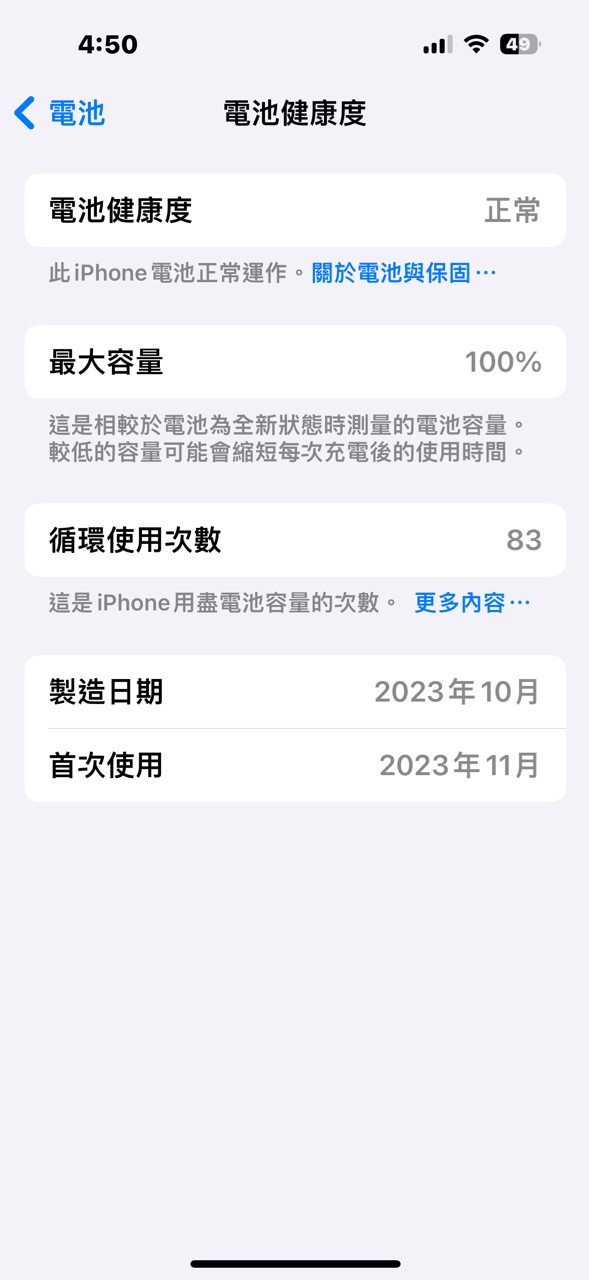 → pxhome: 2023年11月購入,充電最佳化,目前循環83次,健康度100。 07/28 16:51