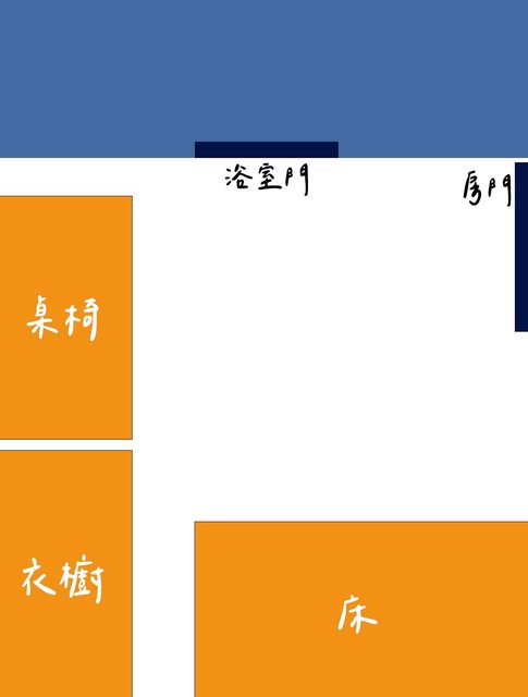 坐在書桌前,右後方是浴室門,而房門口在正背面。