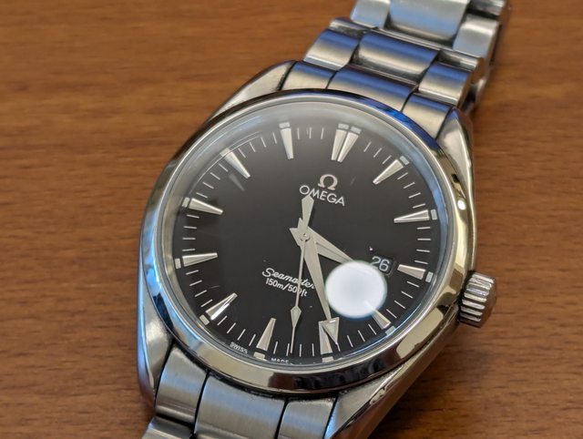 三、 型號:2517.50.00 錶徑:39mm 面盤顏色:黑色 Omega Aqua Terra系列 39mm錶徑,鋼帶, 石英機芯方便, 經典系列超帥,正裝、運動都合適, 狀態良好,輕微使用痕跡,鏡面無傷, 單錶無盒單,本人手圍約19-20mm, 剩餘錶節一目 售價:40000 http://i.imgur.com/LIrEVsE.jpg