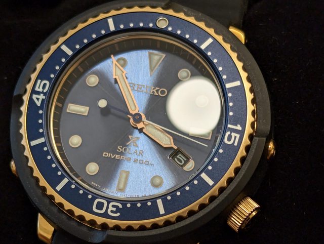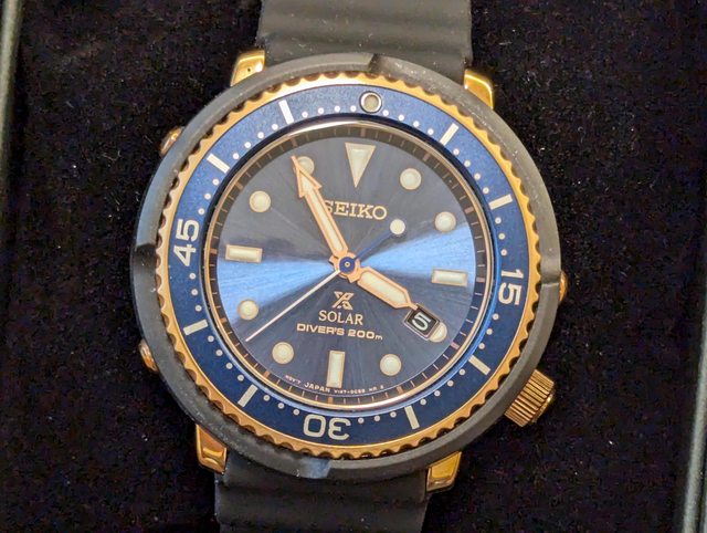 五、 型號:STBR008 錶徑:42.7mm 面盤顏色:藍面金圈 鮪魚罐頭系列 小版的鮪魚罐頭, 42.7錶徑男女都適合, 比較不會太大顯得突兀, 藍面金圈非常好看,膠帶。 太陽能動力方便。 少用近全新,幾乎無使用痕跡, 盒裝、保卡齊全(日本購入), 保卡年份2023 售價:10000 http://i.imgur.com/vhYAPcu.jpg