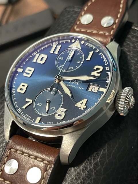 IWC大飛46MM第一次有計時功能、錶面對稱協調、手上鍊八日動力、經典放射藍面盤