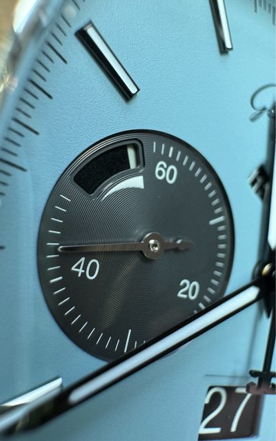 2. 計時的小時以數字顯示清楚很多、全景日期也超大、動儲顯示藏在小秒針內很棒。